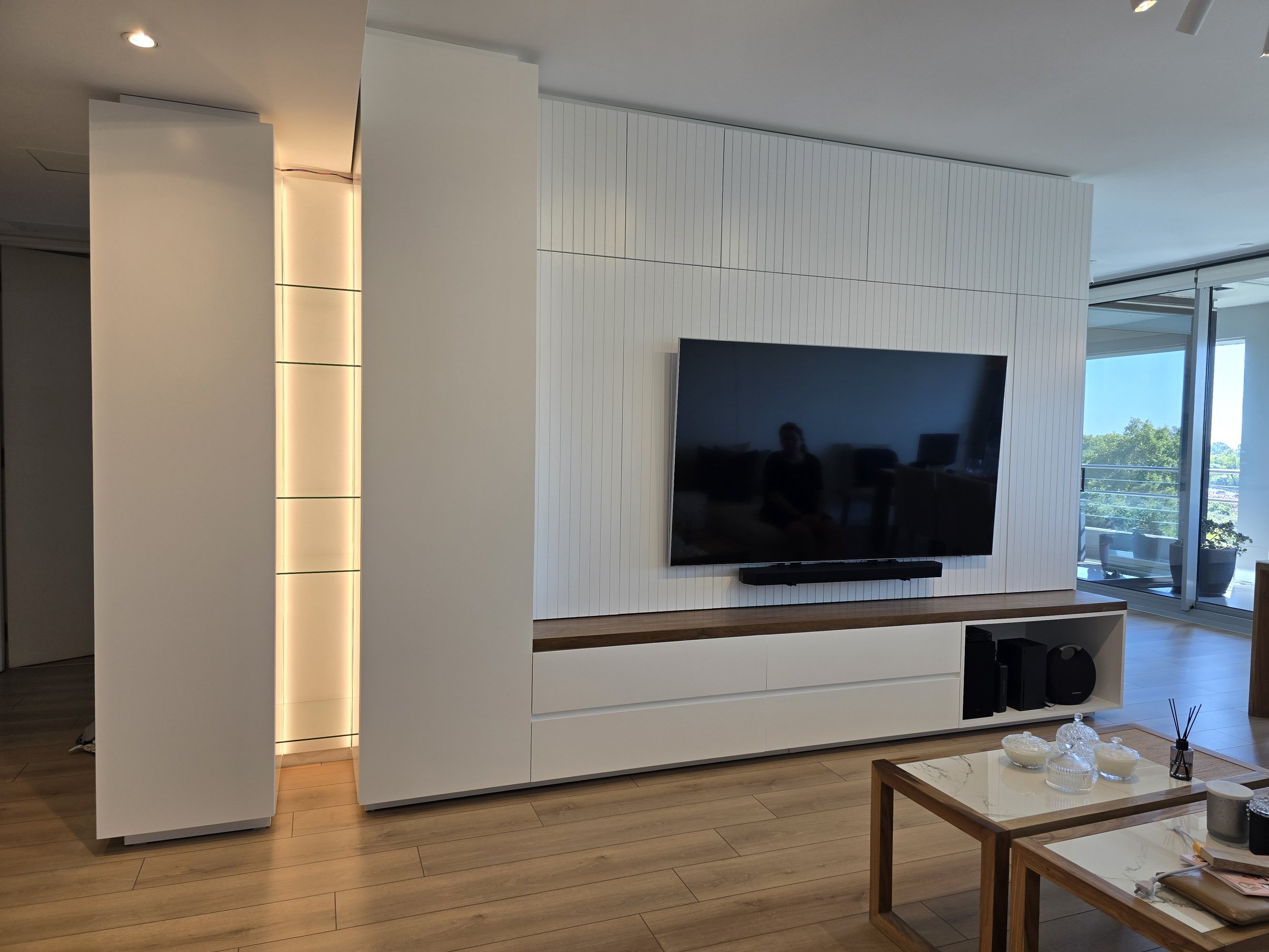 En este Proyecto Smart, nuestra meta fue responder a dos requerimientos clave de la clienta: una solución eficiente para el guardado de ropa colgada y la integración sin fisuras de su sistema multimedia en el living.